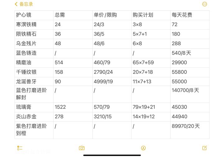 20天打造橙色护心镜前8天每天花费23万黄金加540鬼心岩,后12天每天花费9万黄金。