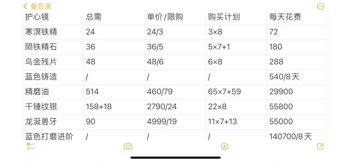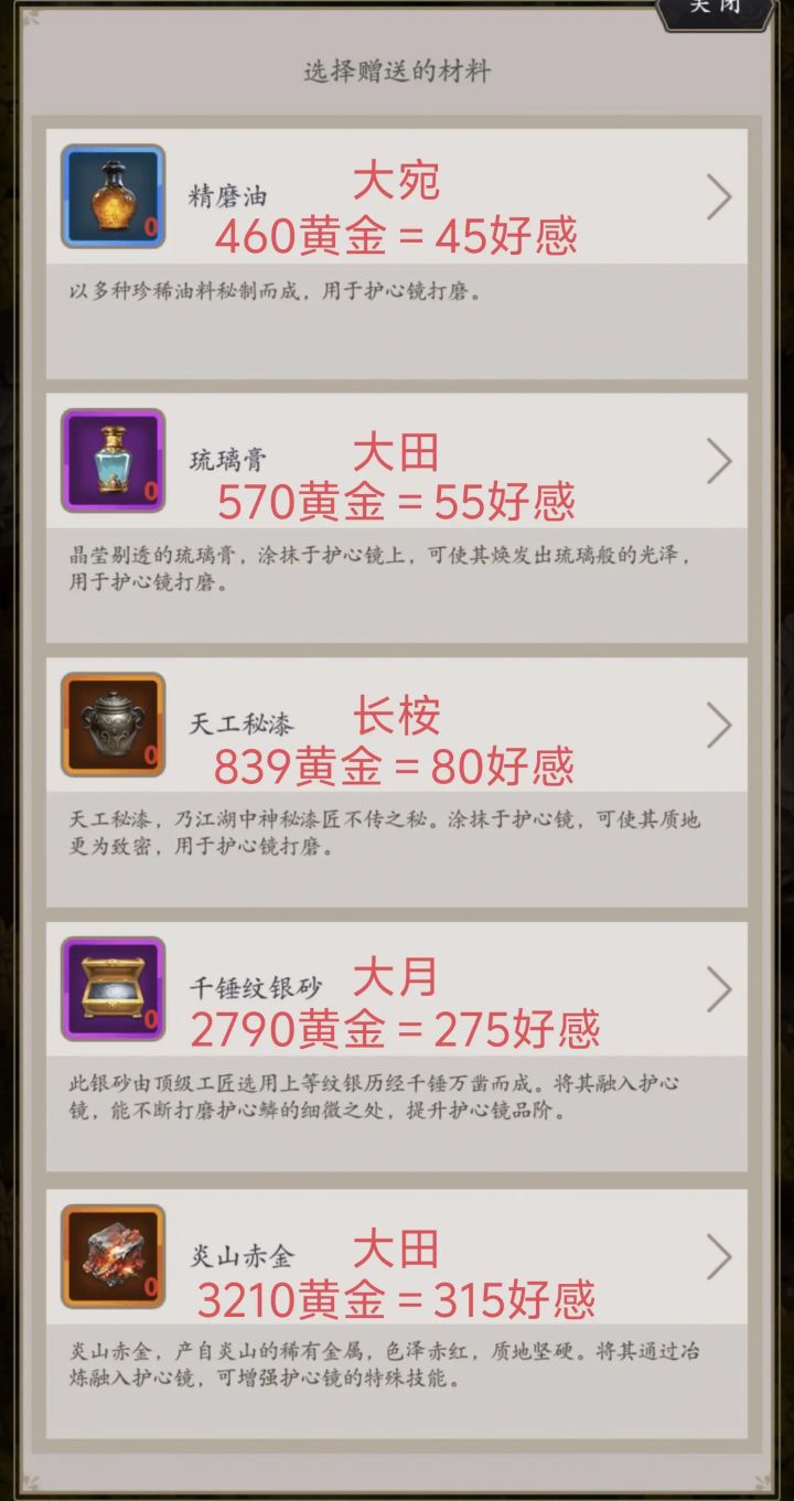 第二张图:主要为8天从零开始打造紫色护心镜,包含好感度,这里我们只需要好感度达到泛泛之交购买龙涎兽牙解封即可,需要5000好感度,规划为18个千锤纹银砂加1个琉璃膏。