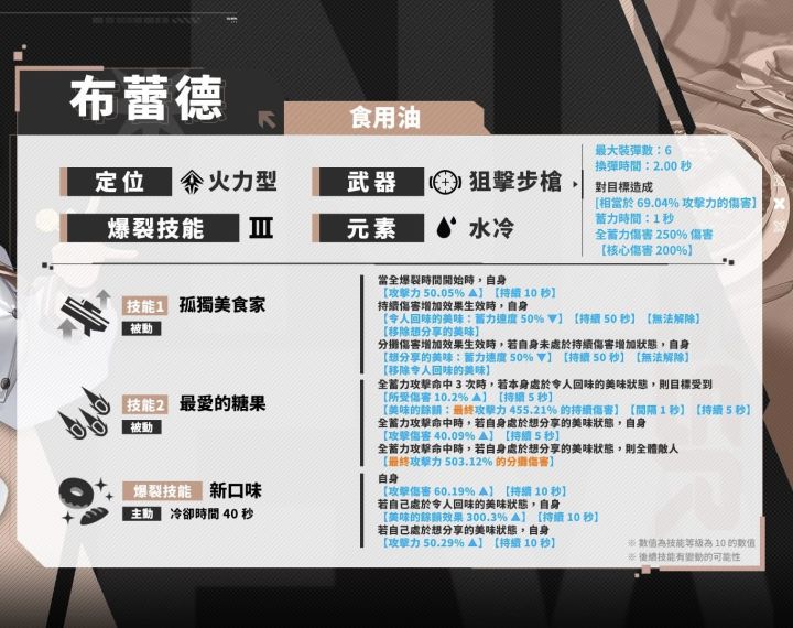 布蕾德是可以根据队友提供的增益效果,将攻击效果变为持续伤害和分摊伤害的火力型妮姬。