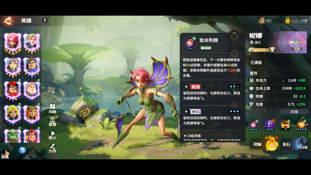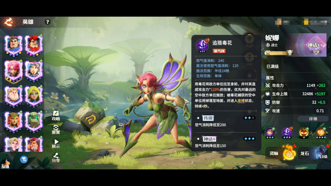 妮娜的技能为对空控制与偷取防御,可以捕获空中单位拉至地面,并造成束缚;也可以“偷取”敌方的防御,降低敌方防御并加持到自己身上!提升到史诗、神话后还可以偷取攻击力。