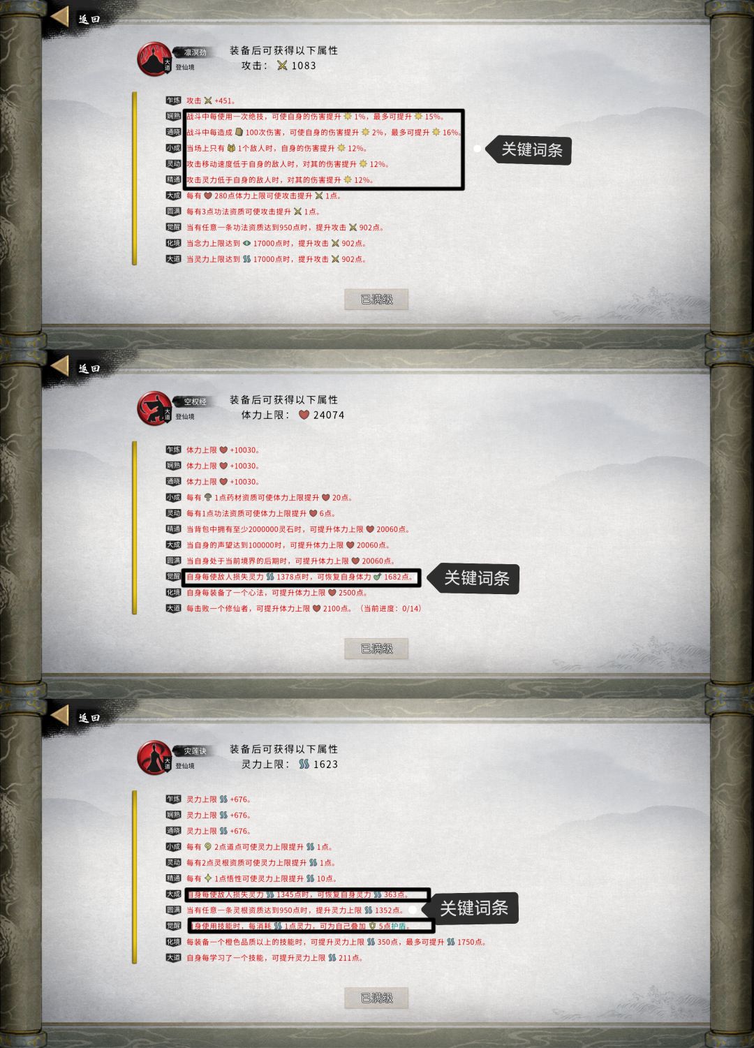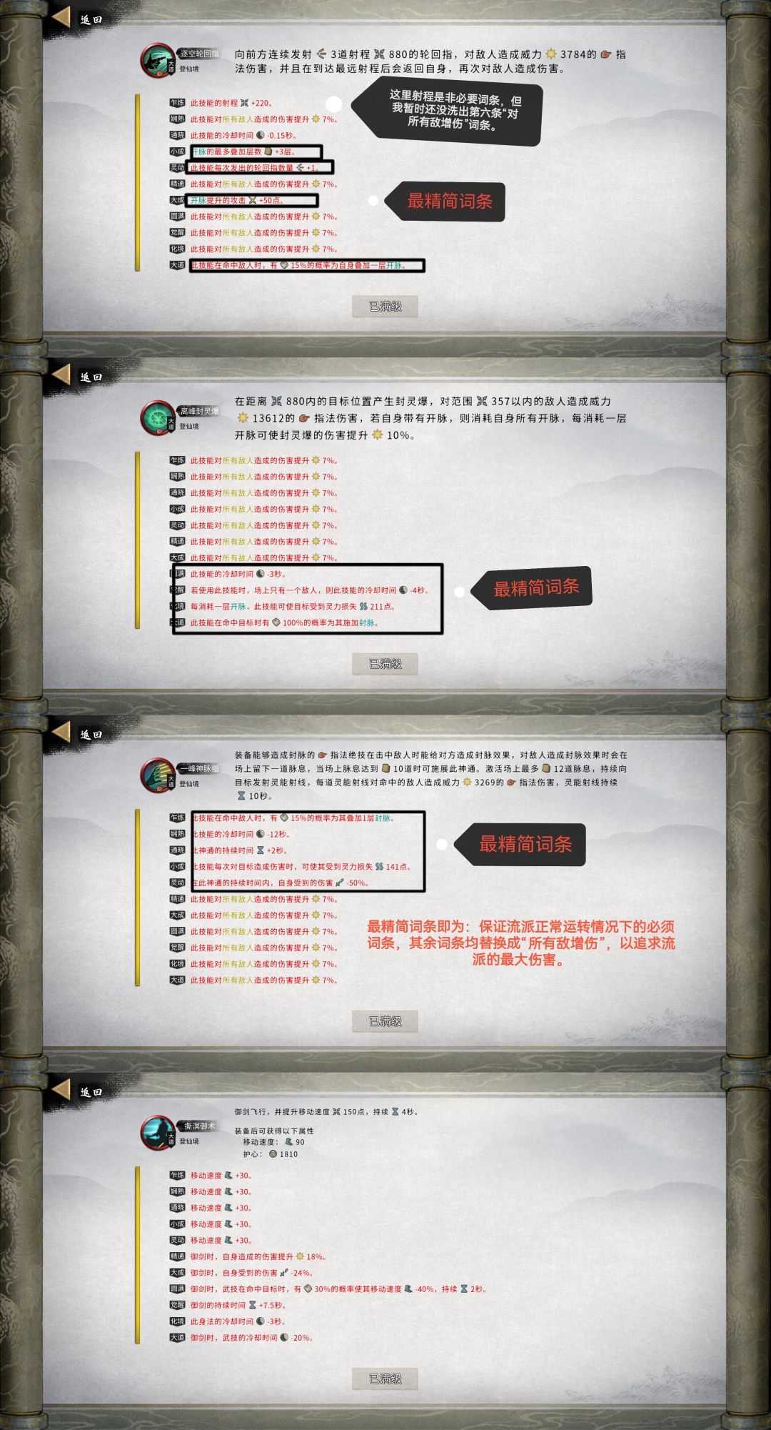 2.技能(武技/绝技/神通/身法)和个别重点心法(指神功/指密卷/剑大法/劲/决/经)如图,并附上备注帮助抓重点。传承心法:洞神功+洞密卷+洞决+洞录4件套&渡江云劲+渡江云经2件套(开脉和内需选择建议,因为字数限制,我放在评论区);