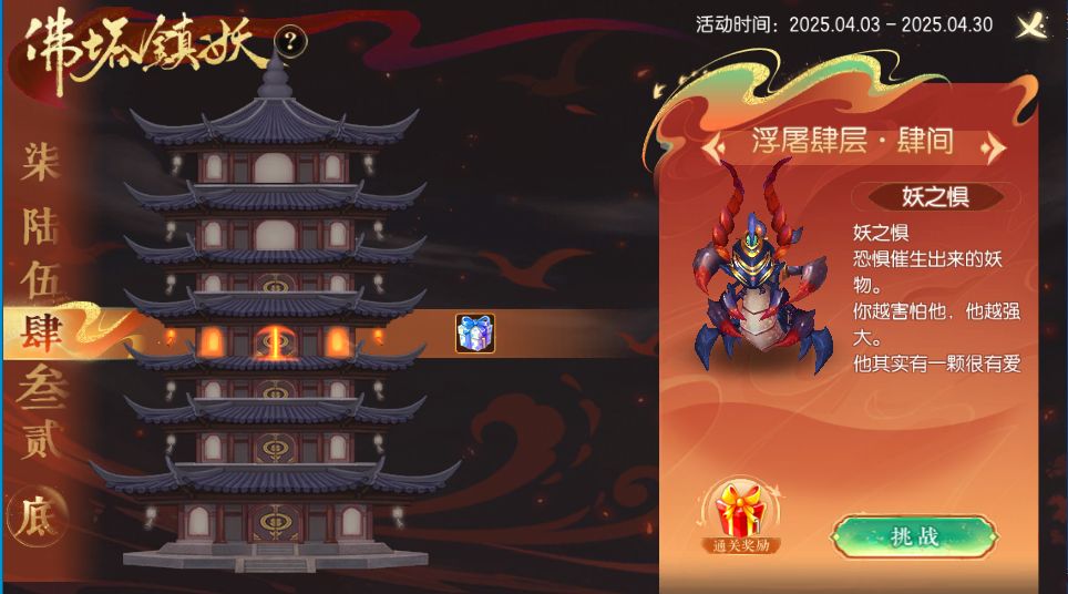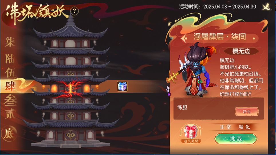 第四层的小怪分别为惧之妖、妖之惧,boss为惧无边。如果在通过boss关卡时无法击败魔化的它,可以尝试完成净化任务“练胆”来让它恢复正常。