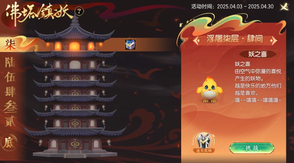 4月3日至4月29日期间,等级≥30级的少侠可以组队参与【佛塔镇妖】活动。在这里,少侠将帮助许仕林去镇压受魔气影响的怪物,最后从佛塔中将自己的母亲白素贞解救出来。