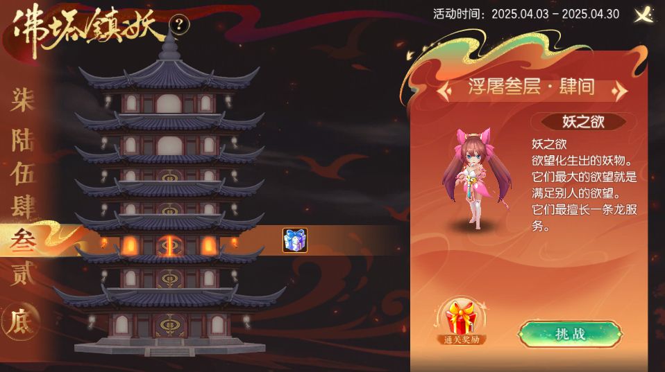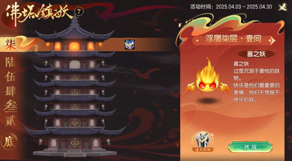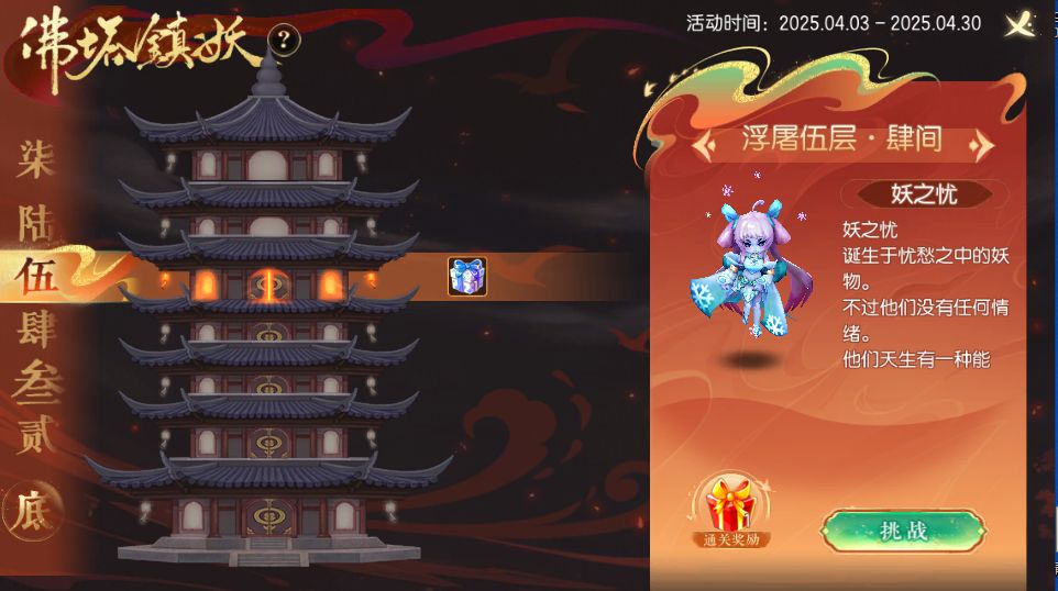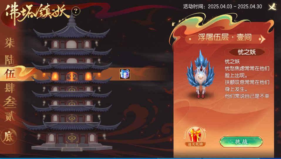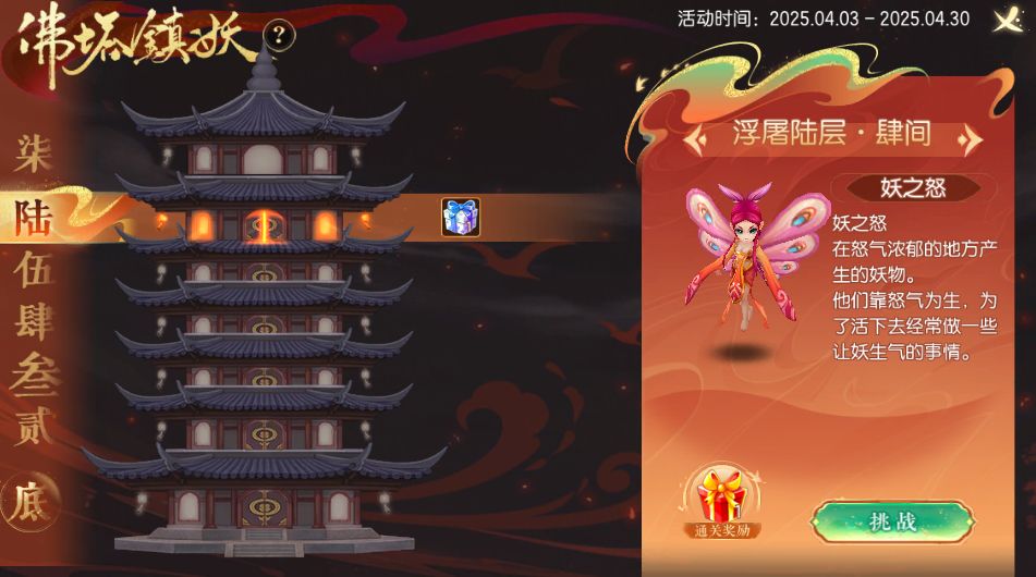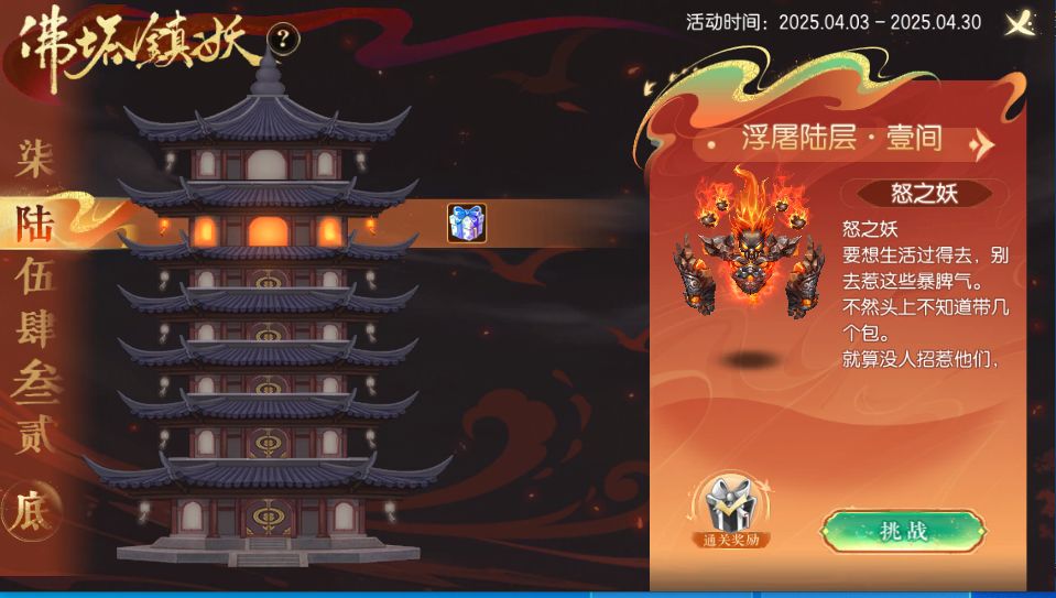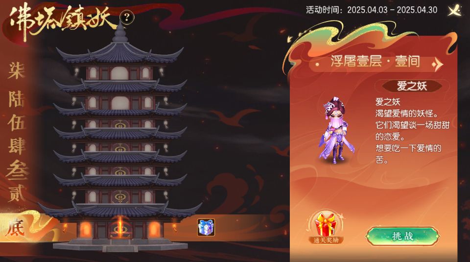 【佛塔镇妖】共有七层关卡,少侠们需要从上往下挑战,每一层都有各自的小怪以及boss。