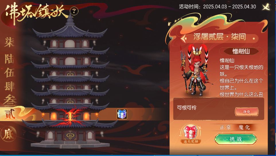第二层的小怪分别为憎之妖、妖之憎,boss为憎削仙。如果在通过boss关卡时无法击败魔化的它,可以尝试完成净化任务“可恨可怜”来让它恢复正常。