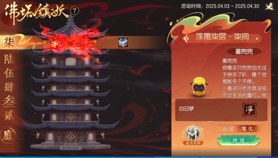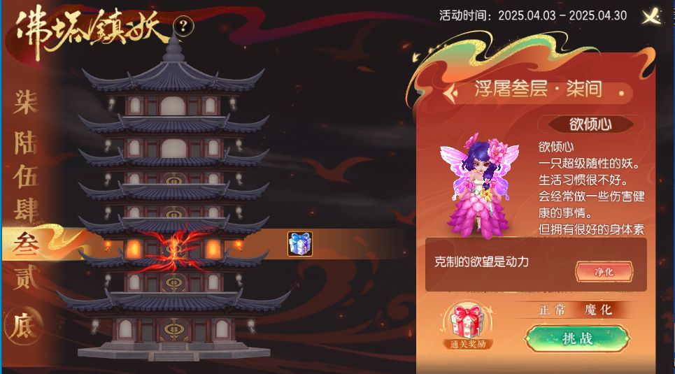 在佛塔中,少侠需要从上往下进行镇妖挑战,每一层将会遇到6关小怪关卡,以及一关BOSS关卡。在BOSS关卡中,魔化状态下的BOSS拥有强劲的实力,如果少侠实力尚且不足,可以选择完成净化任务来对战正常状态的BOSS。挑战完一层BOSS后可以领取这一层的奖励。