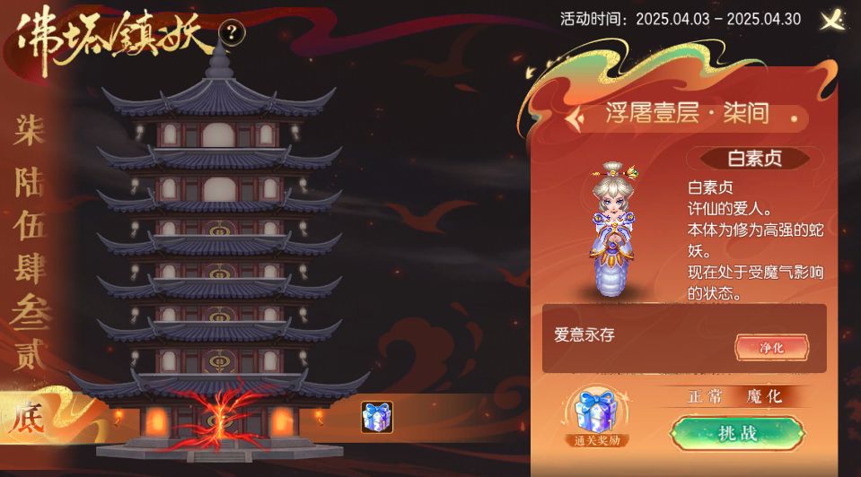 第一层的小怪分别为爱之妖、妖之爱,boss为白素贞。如果在通过boss关卡时无法击败魔化的它,可以尝试完成净化任务“爱意永存”来让它恢复正常。