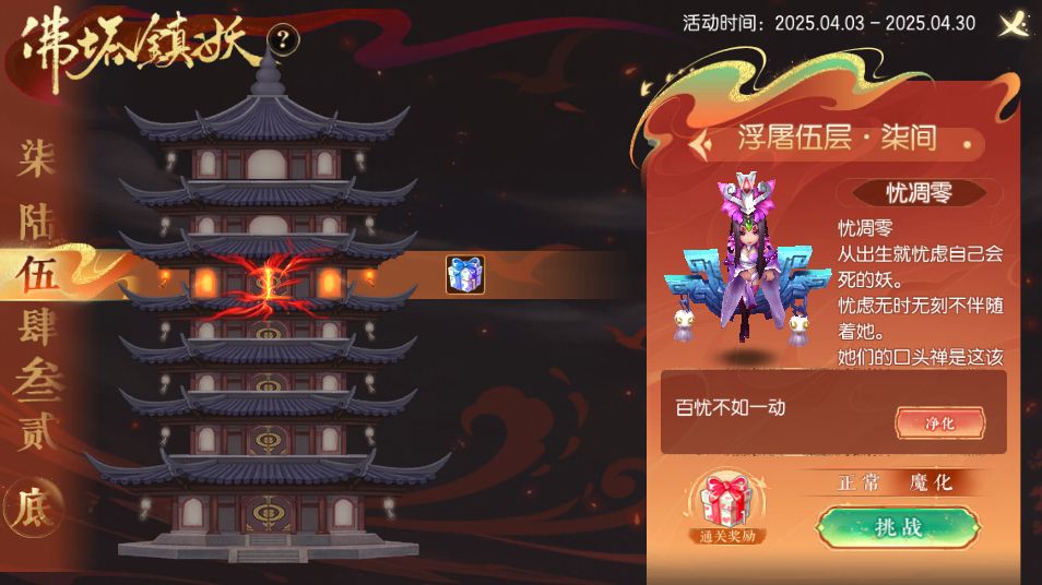 第五层的小怪分别为忧之妖、妖之忧,boss为忧凋零。如果在通过boss关卡时无法击败魔化的它,可以尝试完成净化任务“百忧不如一动”来让它恢复正常。