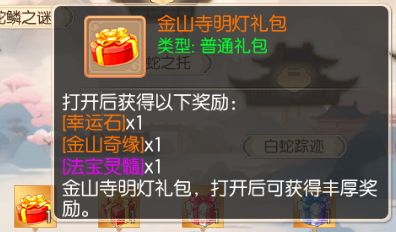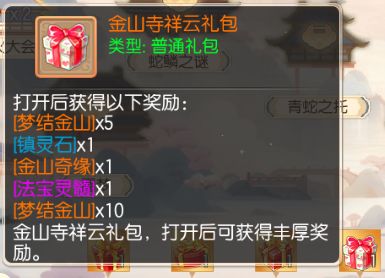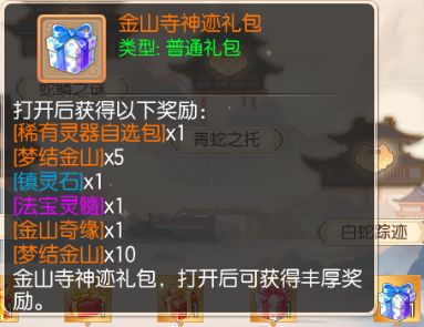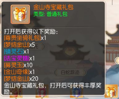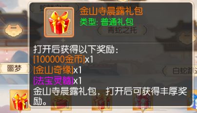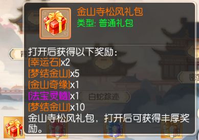 每完成一个剧情节点,就能获得5点进度值,进度值达到指定数量时,就可获取丰厚奖励。其中,进度值达到15时,可以领取「金山寺晨露礼包」,进度值达到30时,可领取「金山寺明灯礼包」,进度值达到45时,可领取「金山寺松风礼包」,进度值达到60时,可领取「金山寺祥云礼包」,进度值达到80时,可领取「金山寺神迹礼包」,进度值达到100时,可领取「金山寺宝藏礼包」。