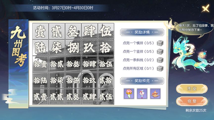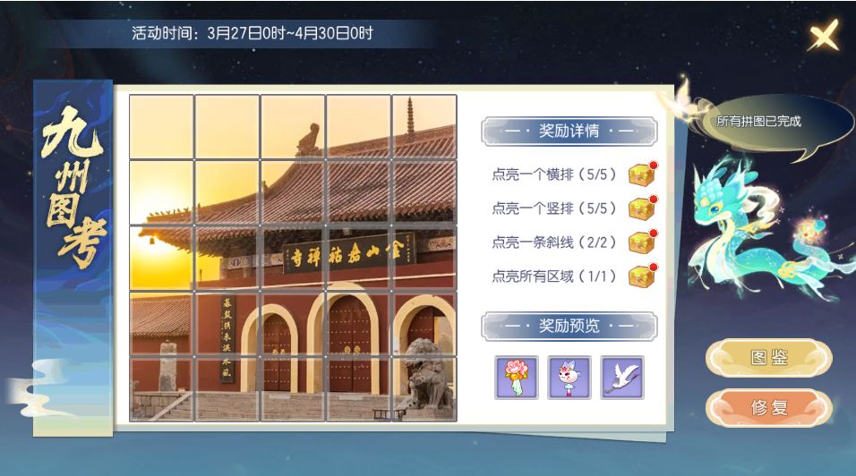 活动开启时,少侠们每天可以获得1次拼图机会,如果少侠当天有事情无法完成拼图,则会累计修复次数,同时,如果拼图失败或者中途关闭拼图页面,拼图次数不会被减少。找到活动日常-节日活动面板,点击参加【九州图考-金山寺】任务进入活动页面,点击修复即可进入拼图界面。