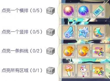 当封面的点亮进度可以形成一个竖排时,即可领取竖排奖励,最多领取5次;当点亮一个横排后也可以获得奖励,最多领取5次;当点亮一个斜线时,也可领取奖励,最多领取2次。