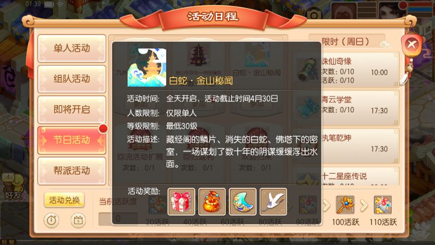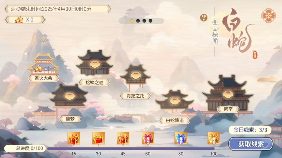 4月3日至4月29日,等级≥30级的少侠请单人参与【金山秘闻】活动。少侠每日在【佛塔镇妖】活动中可以获得指定数量的“秘闻线索”道具,利用“秘闻线索”道具即可解锁【白蛇·金山秘闻】活动中的故事节点,随着故事进度的推进,少侠即可获得丰厚的奖励回报哦!
