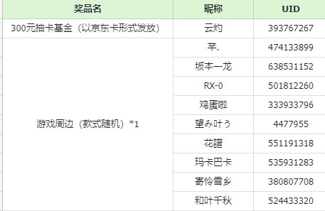 活动结束后,从所有符合要求的居民中,随机抽选1位送出300元抽卡基金(以京东卡形式发放);9位送出游戏周边(款式随机)*1