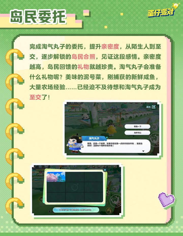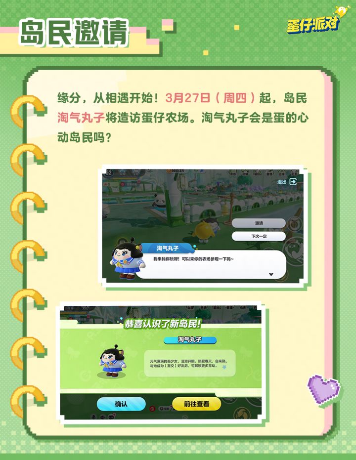 3月27日(周四)更新后,蛋仔农场新增【岛民来访】玩法,第一位即将来访的岛民是——淘气丸子。