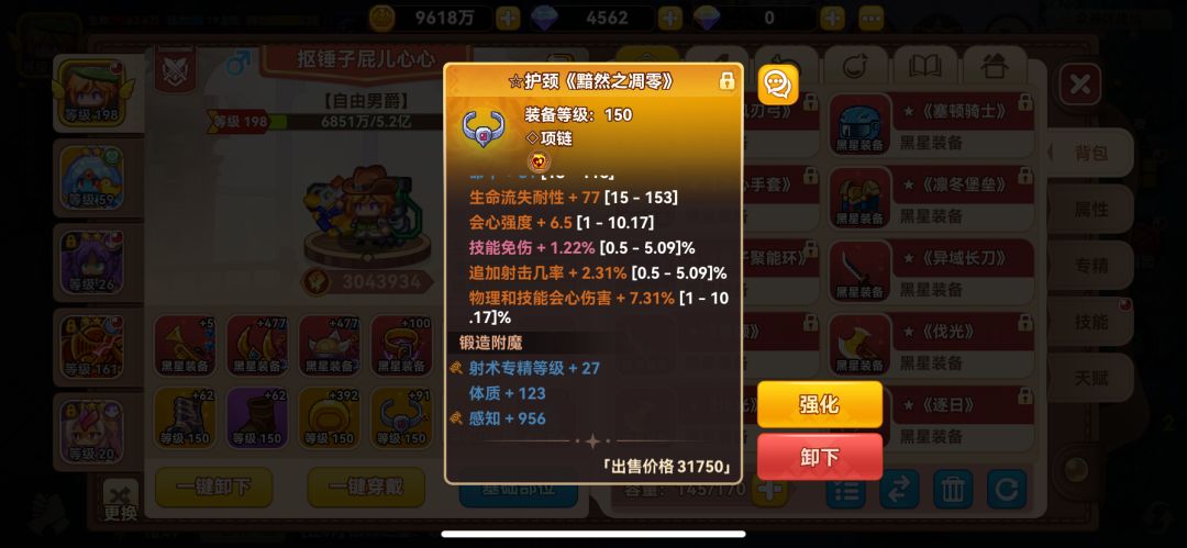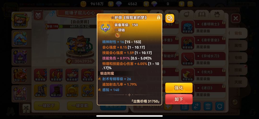 1、装备选择:远程武器水枪目前最强输出,近战武器首选光剑能增加大概50%远程伤害,其次徽章商店里那个喇叭68追伤,然后指虎26追伤。头盔的话目前就三个无头,灵感,牛仔冒。手套魔皮,沐心即可。鞋子虎头鞋追伤50,50追伤大概有2%伤害提升,另一个鞋子部位等后面几天更新后的舞步。腰带的话只推荐冠军腰带51追伤,因为猎人的风精灵不需要刻意堆追射几率,所以可以不用马格兰。戒子和项链很重要尽量选择追伤高的合金戒子和护颈,属性优先暴击伤害、感知、会心、体力,尽量满肢体戒子项链。披风的话抽出兽王腰带可以等到下次更新修复bug后使用,其余没啥好披风如果硬要选就150级白金披风感知带协调专精属性的。锻造的话全部锻造射术和感知。目前我的号1回合4连射可以打机器人10亿血,可以参考一下属性。