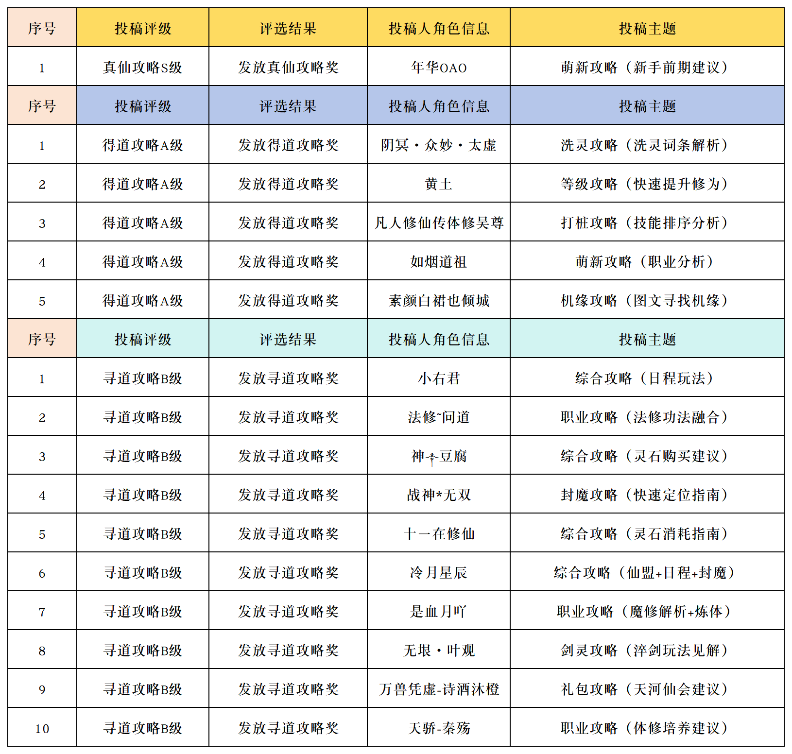 2. 真仙、得道、寻道攻略的奖励将于入选名单公布后的7个工作日内发放,请道友耐心等待。按照问卷星后台角色填答记录发奖(换角色请评论区留言),若发奖时不属于游戏活跃玩家(7天内未登录)则不符合发奖资格。