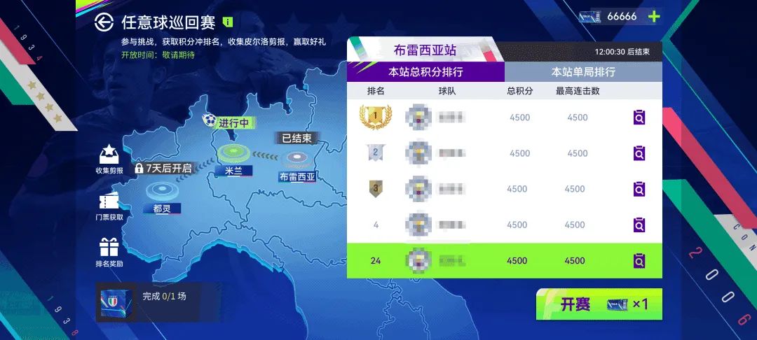 最高单局积分排名奖励:在每个巡回赛站点中达到指定排名分段,将获得意大利球员包、布雷西亚、红黑军团、斑马军团时期皮尔洛头像。