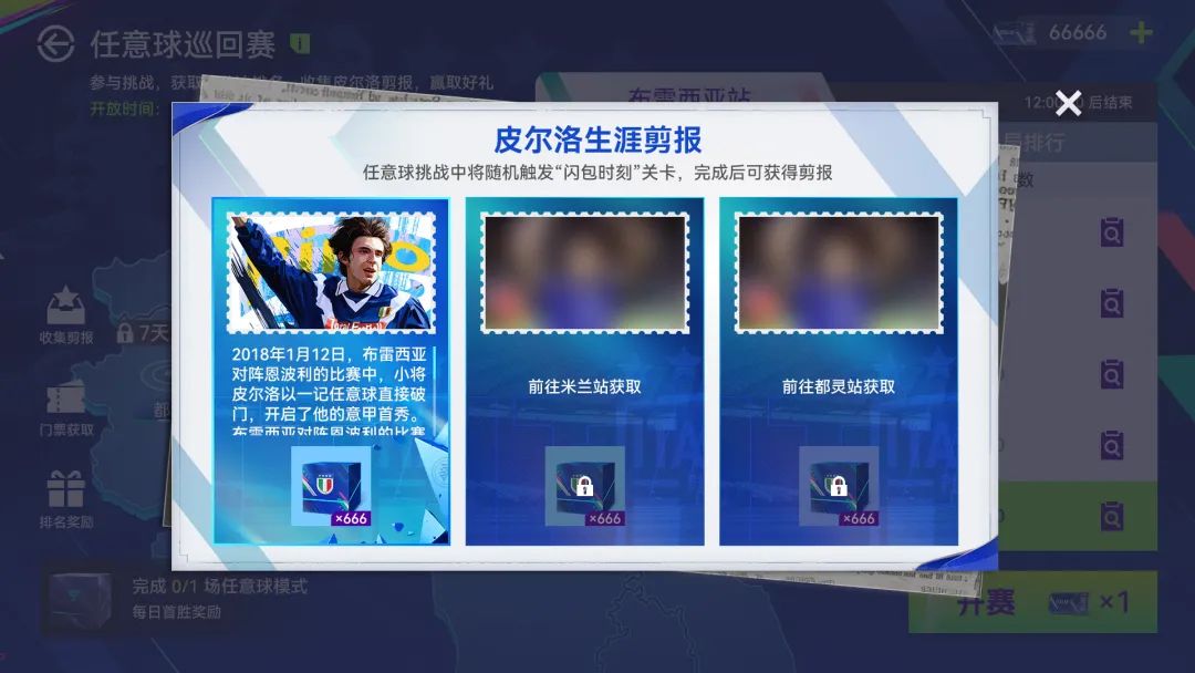 玩家在每局任意球挑战结束后,将随机触发”闪回时刻“彩蛋关卡,完成”闪回时刻“彩蛋关卡将获得对应”皮尔洛生涯剪报“与相应奖励。