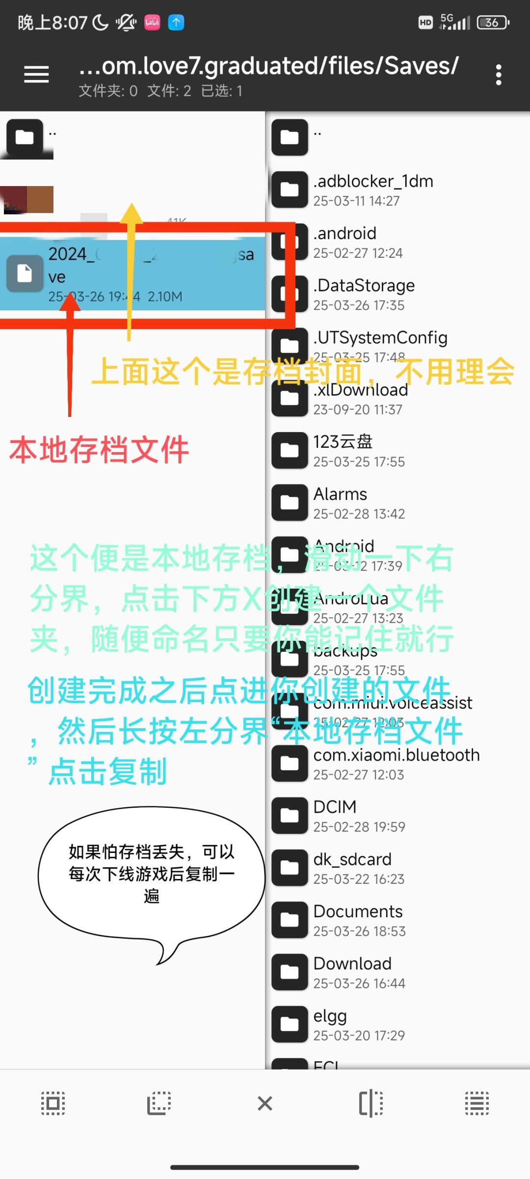 非常的简单,就是在你游戏的存档文件夹Android/data/com.love7.graduated/files/Saves里把你的本地存档复制一遍保存就行了