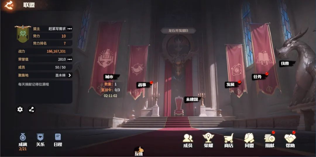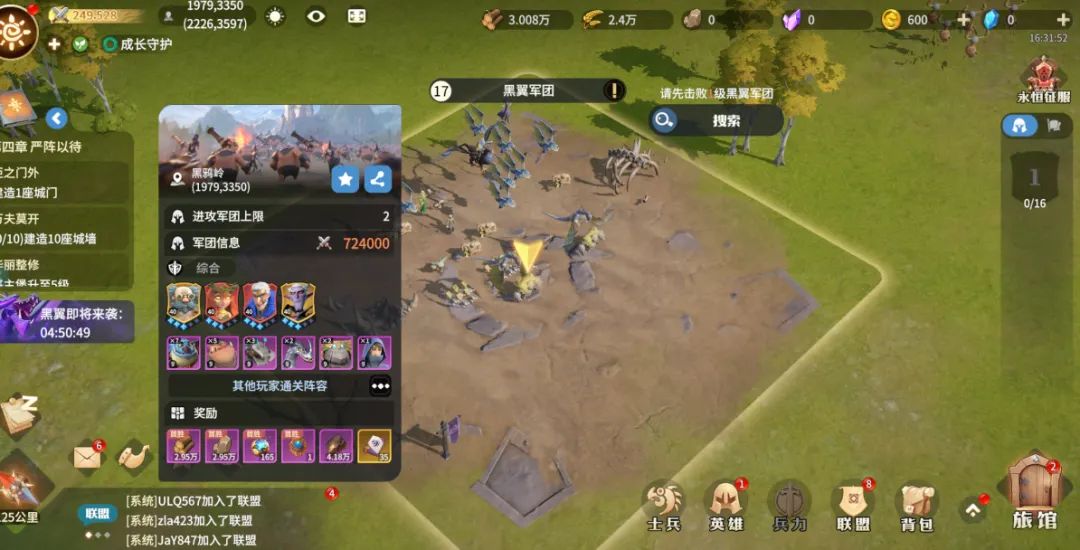 3、加入联盟:联盟作为游戏中唯一的领主组织,需要在联盟功能开启后,尽快加入或创建联盟,无需等待联盟中心开放。加入联盟后,观察盟友的活跃程度,决定自己的去留;
