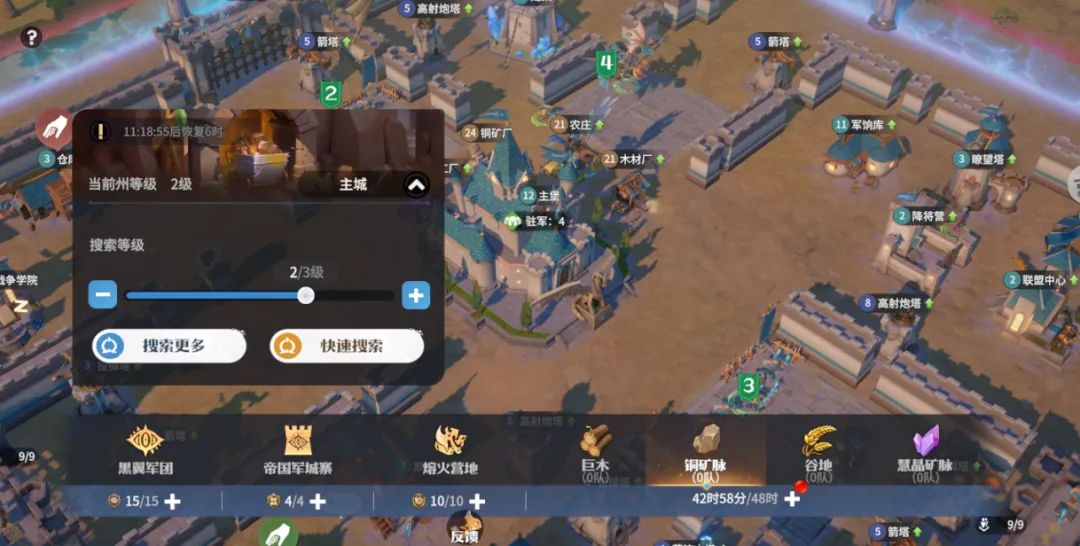 (2)采集功能:主堡5级后,仓库可升至2级解锁铜矿采集,铜矿是前期建筑升级中最容易遇到产能瓶颈的资源,建议新手期优先派遣空闲队伍外出采集,以保证新手期的城建速度;