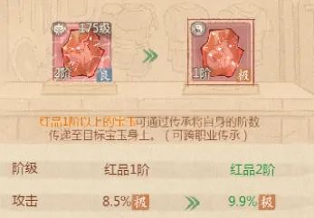 4、宝玉传承红玉的阶数是可以传承的,如果前期条件不足升阶了品质一般的宝玉,后期出现了更好的红玉,我们是可以选择传承将旧玉的阶数传承到新玉上的。(特别提醒传承后旧的玉会消失)注:传承可以跨职业传承也可以跨阶级传承