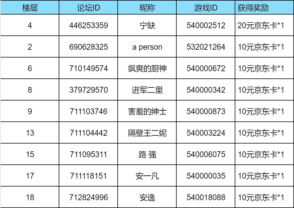 活动结束后,楼层数位于总楼层2%、22%、32%、42%、52%、62%、72%、82%、92%、99%的且符合活动要求的少侠,我们将送上每人20元京东卡*1;