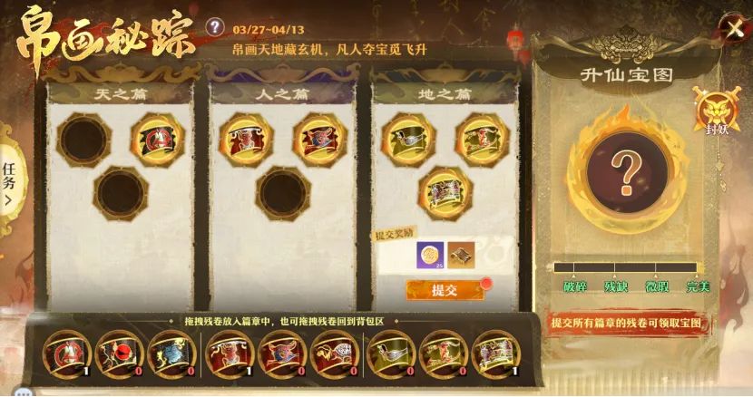 通过完成每日任务积累战令经验,收集随机帛画碎片,拼合至天、地、人三大篇章即可兑换惊喜奖励,更可逐步完善升仙宝图。碎片搭配策略将直接影响宝图完整度,高品质宝图奖励更丰厚!二阶蜃珠、神兽玉玦、神铸令等好礼等你带回!