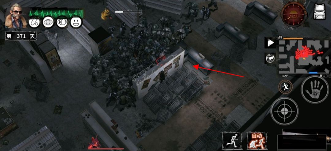 2.塞勒姆超市一楼。这位置跟新纽西超市一楼很像,但卡法不同。人物还是走到箭头处,用武器(推荐用枪)朝右下方怪攻击,使人物索敌攻击并强制移动,就进墙了。