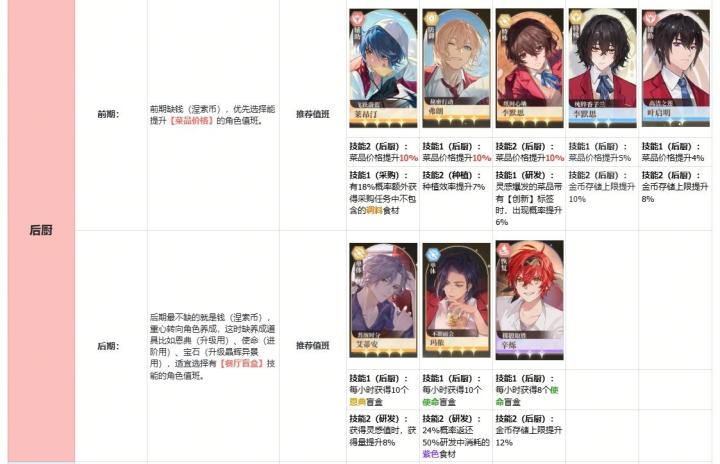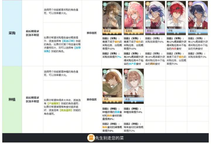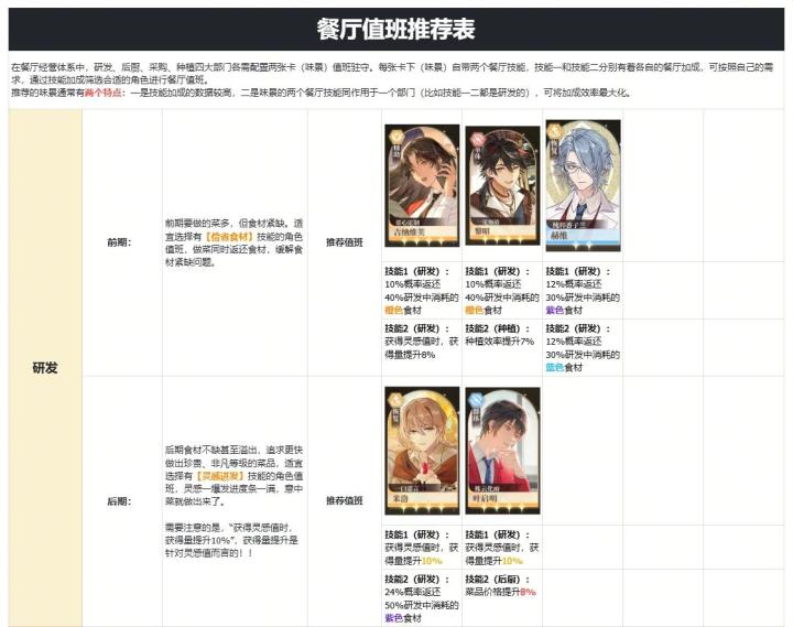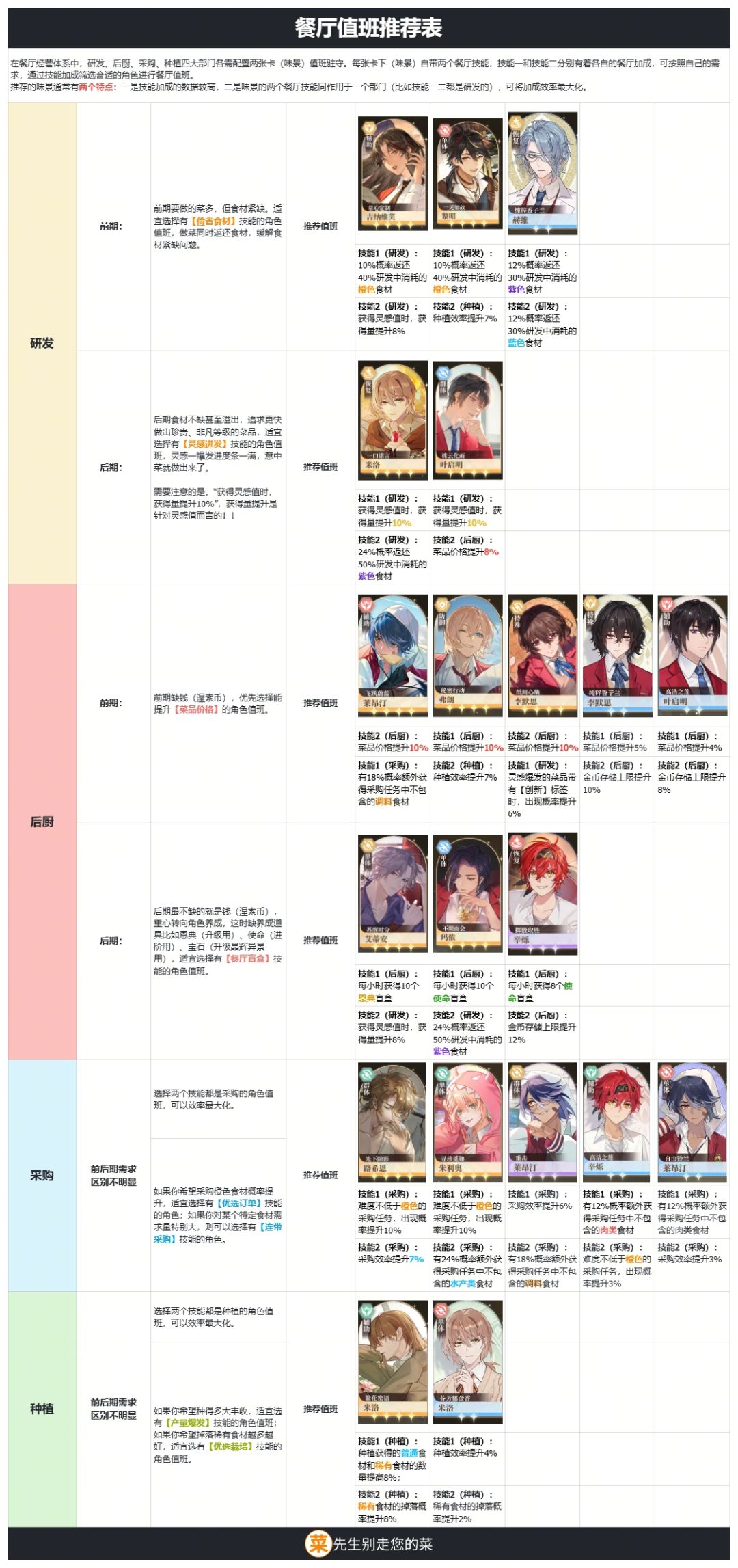 推荐值班的味景通常有两个特点: 1.技能加成的数据较高 2.味景的两个餐厅技能同作用于一个部门(比如技能一二都是研发的),可将加成效率最大化 。