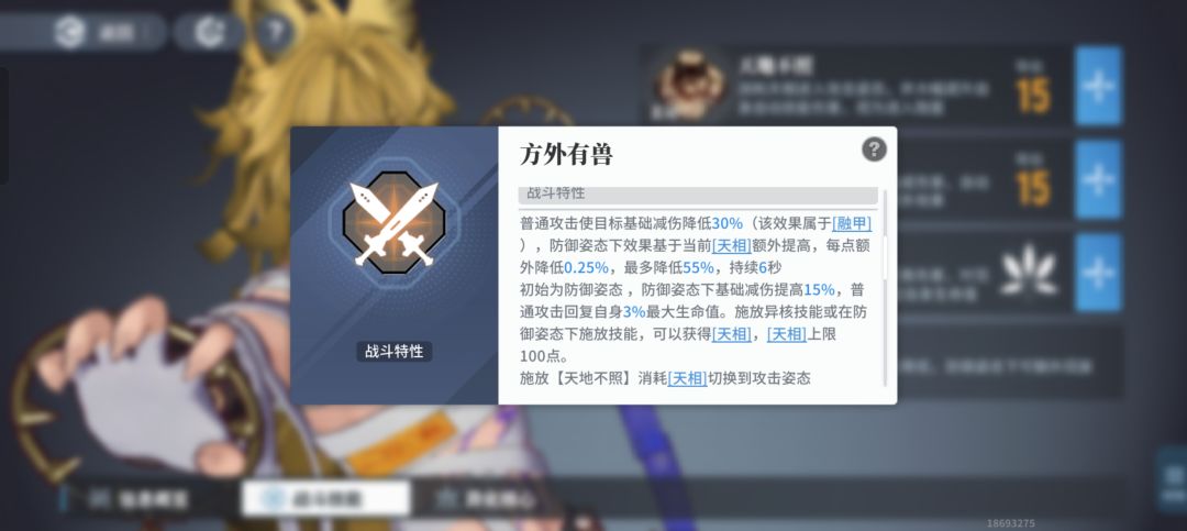 作为buff工具人,常规情况下攻击敌人可常驻30%融甲,随着【天相】累积到100则融甲可叠加到55%,自带普攻回血功能,一定程度上保证自身生存率