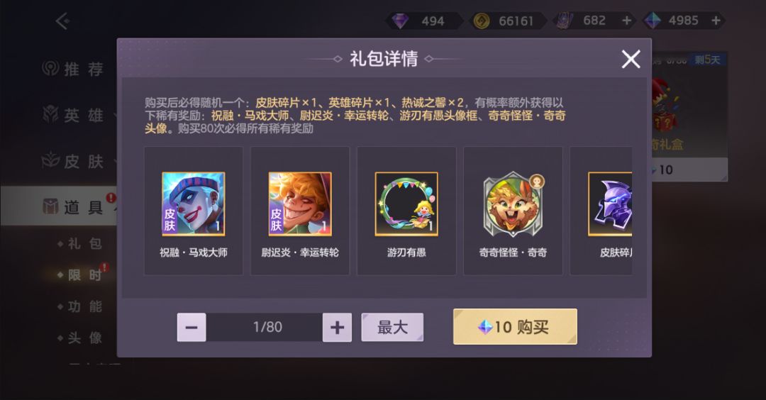 惊奇礼盒限时开售!祝融·马戏大师、尉迟炎·幸运转轮、游刃有愚头像框、奇奇怪怪·奇奇头像等你来抽!最多80抽可获得全部奖励。