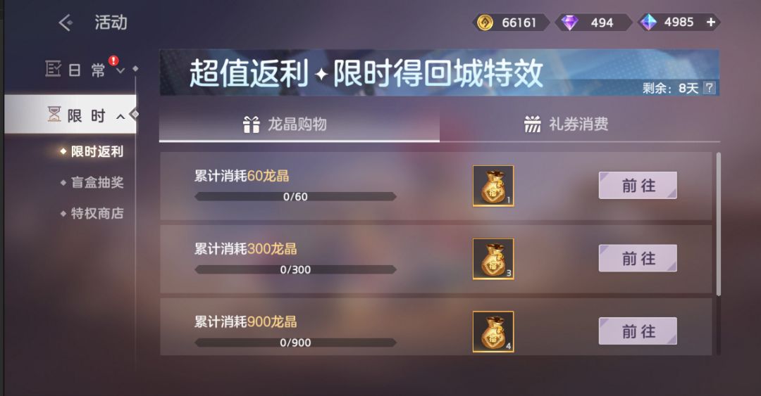 解锁特权卡,享受超值折扣,使用龙晶购买龙魂祈福卡、排位守护卡、皮肤碎片、改名卡等奖励。
