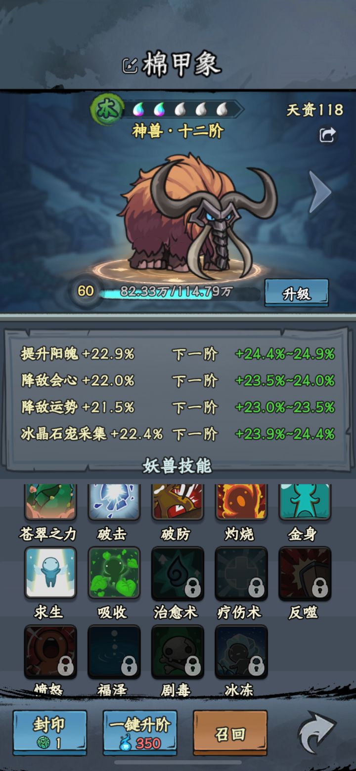 棉甲象是一个天资较高且较容易获取的妖兽,技能具有多种效果,建议新手优先培养。