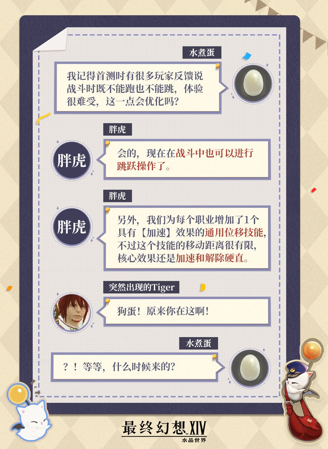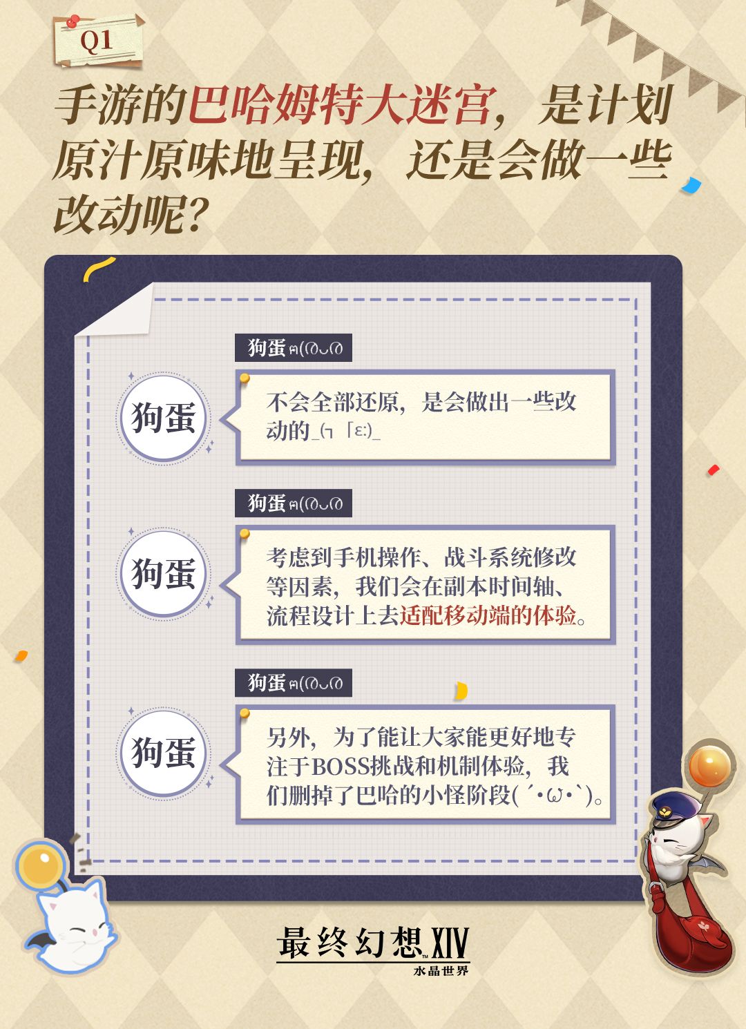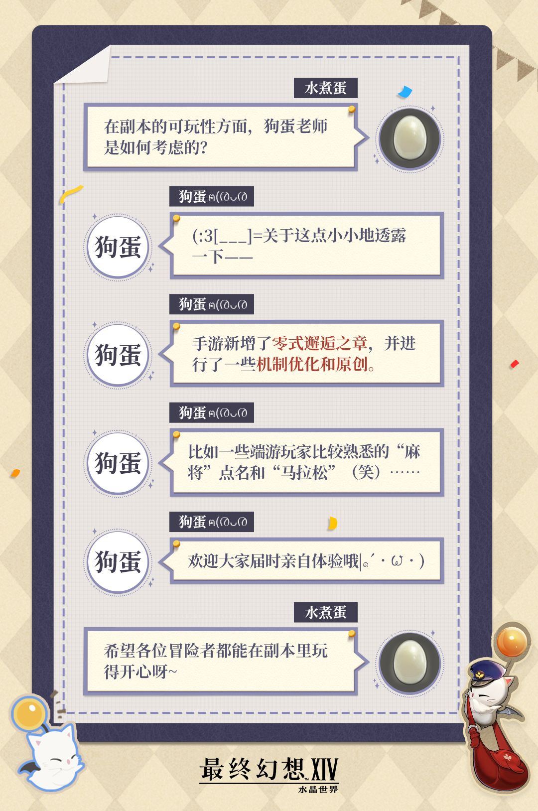 冒险者们有任何问题或是对我们的建议,都可以通过【莫古信箱】告诉我们,我们会定期收集大家的想法并通过本栏目进行回复,欢迎各位冒险者与我们交流!