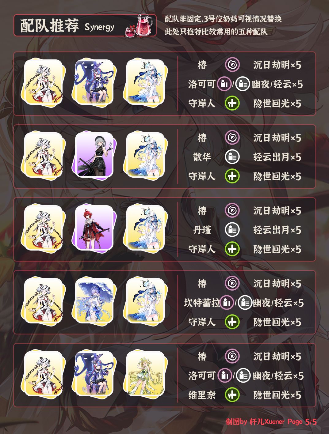 椿定位湮灭主C,主要输出伤害类型是普攻伤害。当前版本各个副本均处于T0地位,必抽角色。新玩家可以先抽0+1,老玩家可以补2链、3链,6链氪佬直接爽玩。椿配队比较简单明了,副C选择洛可可或者散华均可,洛可可自带聚怪,与椿的群伤适配,散华比较考验手法。除此以外次选丹瑾或者坎特蕾拉凑合用,主要吃点湮灭增伤。奶妈优选守岸人,无守岸人用维里奈。