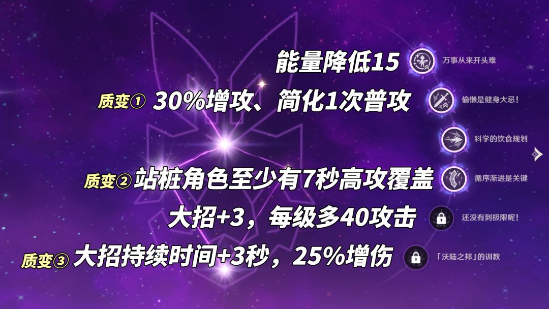 0命可练机制完整,2命简化操作与30%增攻,4命拓宽配队,5命元素爆发等级+3更高攻击提升、6命延长大招3秒与25%增伤。
