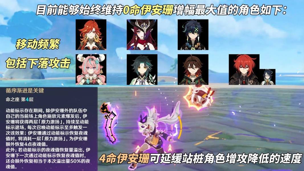 ※而在解锁4命后,伊安珊的夜魂恢复能力增强,此时可搭配任意站桩攻击力主C,班尼特可入队伍,基本伊安珊都可加入其中。