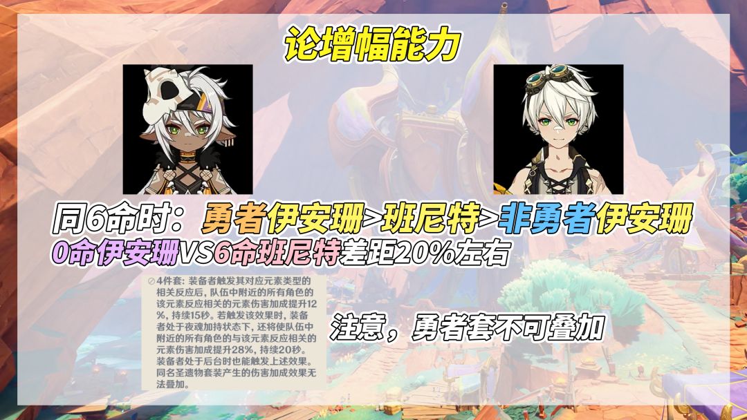【增幅对比班尼特】伊安珊‘天赋9级650攻击(多1级+40攻击)、纳塔户口可带勇者套40%增伤(多套不可叠加)、2命场上角色30%攻击、6命延长夜魂溢出时3秒内场上角色25%增伤’,班尼特‘天赋12级约1054攻击(天空之刃)、可与火C凑双火25%攻击、15%火伤加成’。