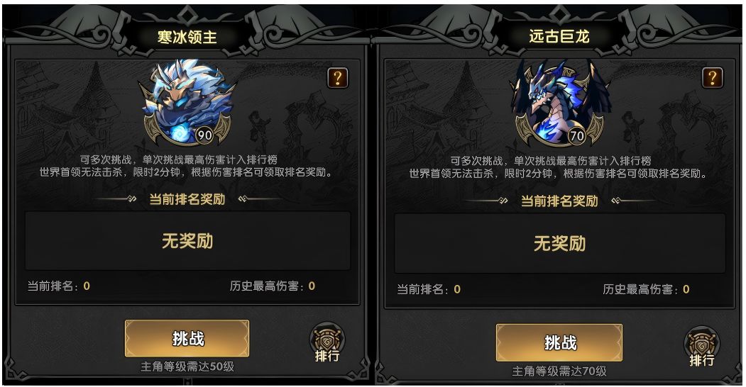 开启条件:主角等级达到50级时可挑战寒冰领主;达到70级可挑战远古巨龙
