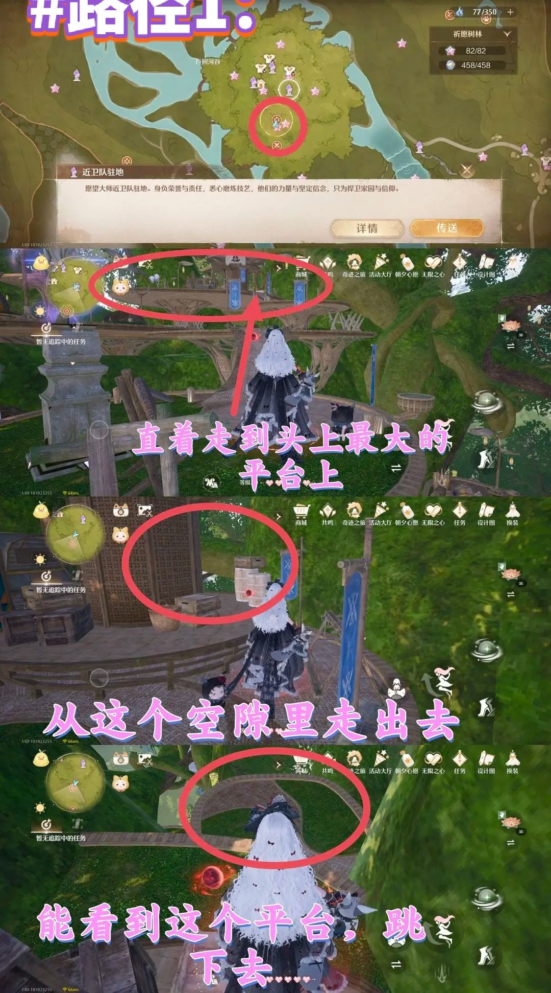路径1:先传送到祈愿森林千愿巨树的近卫队驻地传送点,沿着平台直走到尽头最大的平台,从木桶和建筑物中间的空隙中走出去,低头能看到一些小平台,顺着平台一直往下跳,转身后就能看到左手边木架上的书本