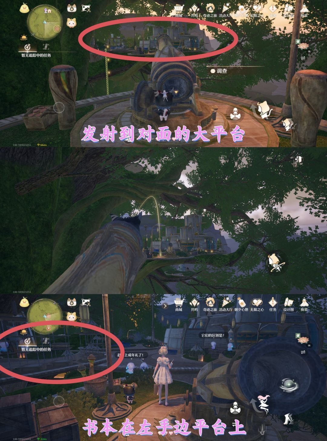 路径2:先传送到祈愿森林千愿巨树的心愿圣殿传送点,向暖暖右手边直走到路灯花处,变小后去坐前方的炮台,发射到对面大平台后,书本就在暖暖左手边平台上的木架上