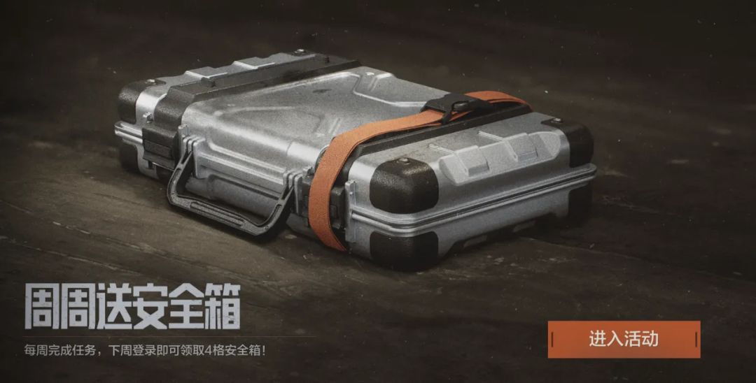 完成每周任务,次周登录即可领取4格安全箱(3天体验卡,领取后28天内有效),助你更轻松携带战利品撤离!