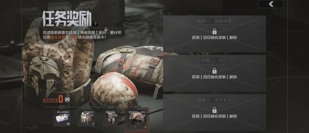 完成章节任务即可获得“铁火战痕”军需卡×10张,以及KN制式防弹衣涂装、运动背囊涂装、6B4型头盔涂装等专属外观奖励。