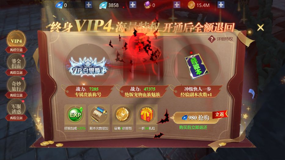 一个月的Vip?这可不行,为了让各位能享受海量特权,一次购买即享终身,而且购买后消耗的980钻石马上返还!你还可以继续购买其他零元购,气泡框,时装面具,AI军服时装,都是购后立返钻石,各位驭龙者你看怎样!