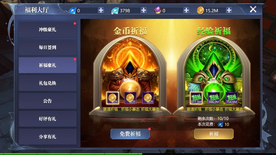 每日定时都有免费祈福,海量金币等你来领。也可以消耗钻石进行经验祈福,经验可是大陆的硬通货,各位驭龙者们记得祈福啦~