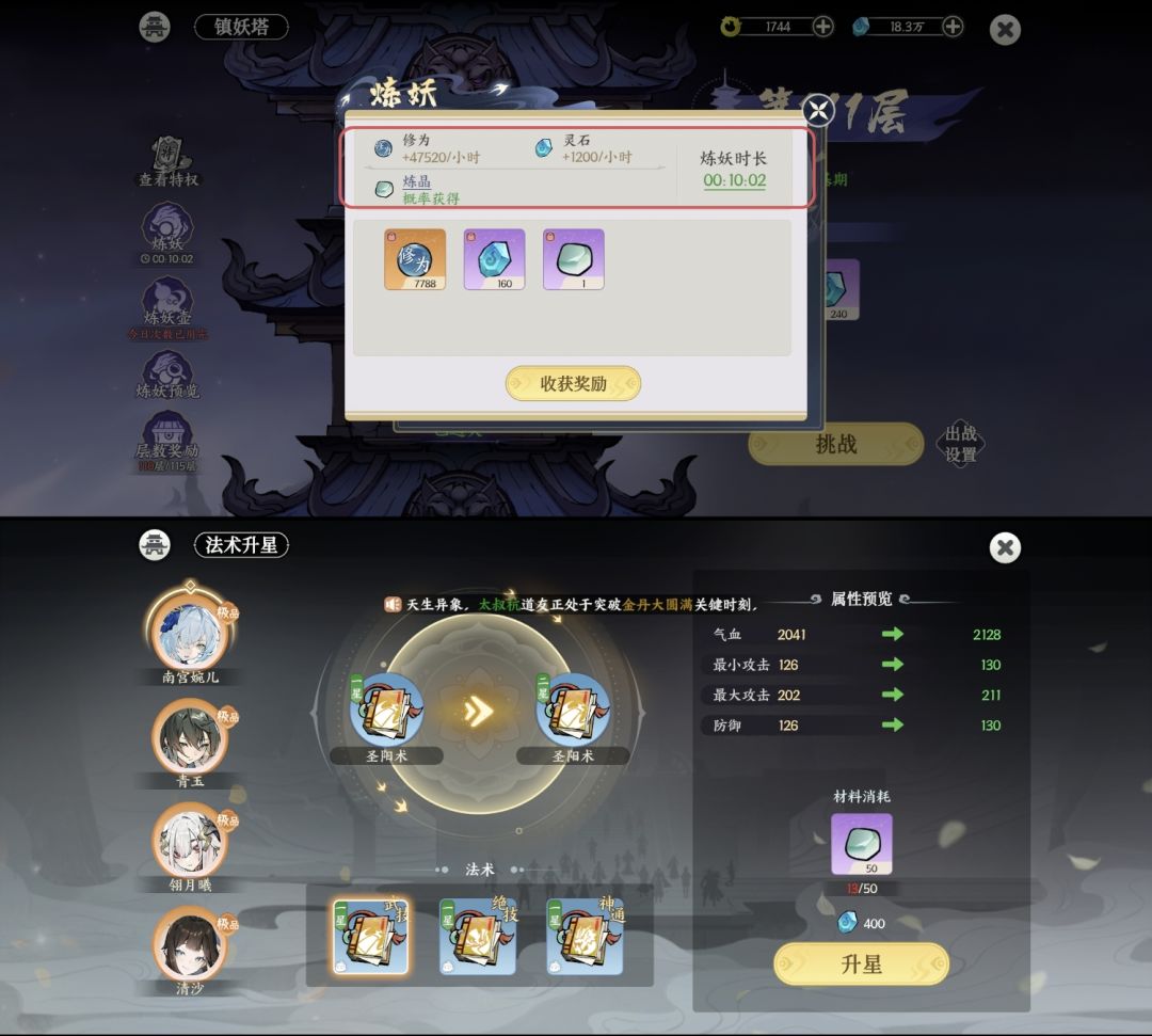 2.关于“镇妖塔”前期很重要,能爬多高就多高(人物筑基中期开始就会卡境界,镇妖塔每层都有高额经验奖励)镇妖塔层数高低决定“炼妖”每时刻的奖励产出(“炼妖”游戏中最稳定的人物经验-灵石和“炼晶”伙伴技能升级材料产出方式)(“炼妖壶”的奖励,快速收获120分钟奖励)建议推到当天极限,再用炼妖壶。