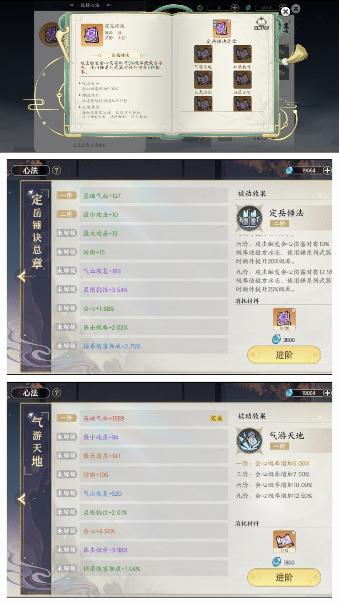 定岳锤决的精炼和配套的玄阶篇“气游天地”精炼也会增加更高效果。 ♥心法选择刀和锤♥