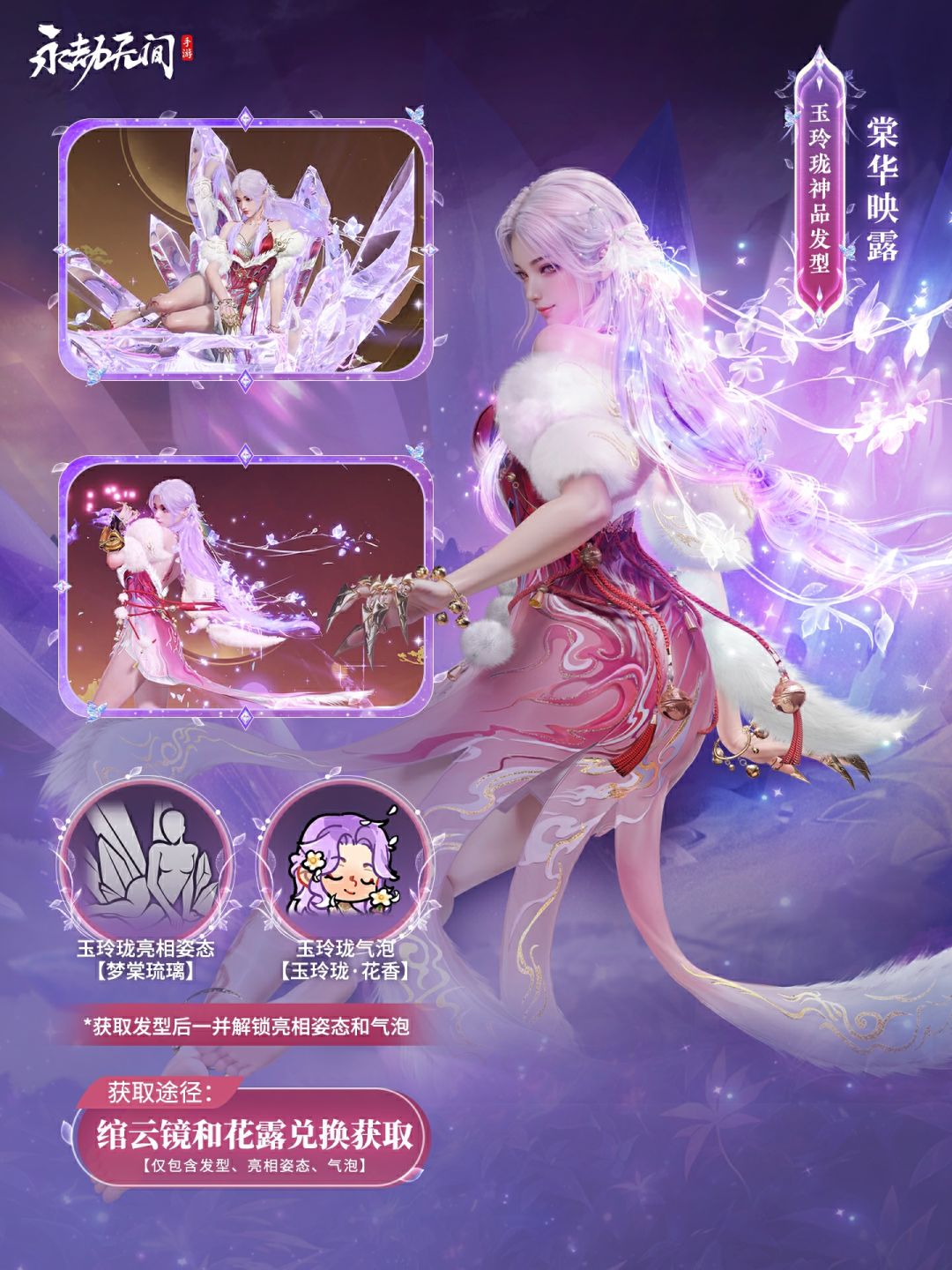 获得玉玲珑神品发型后,附赠亮相姿态【梦棠琉璃】以及表情气泡【玉玲珑·花香】哦!