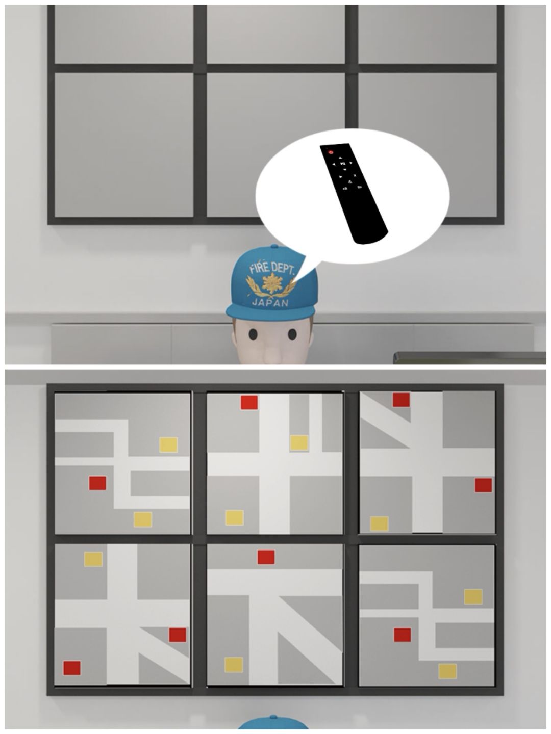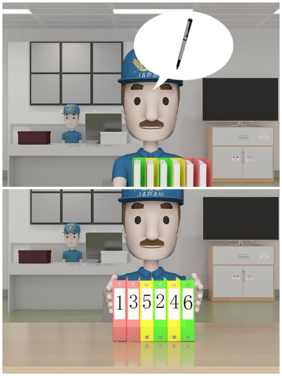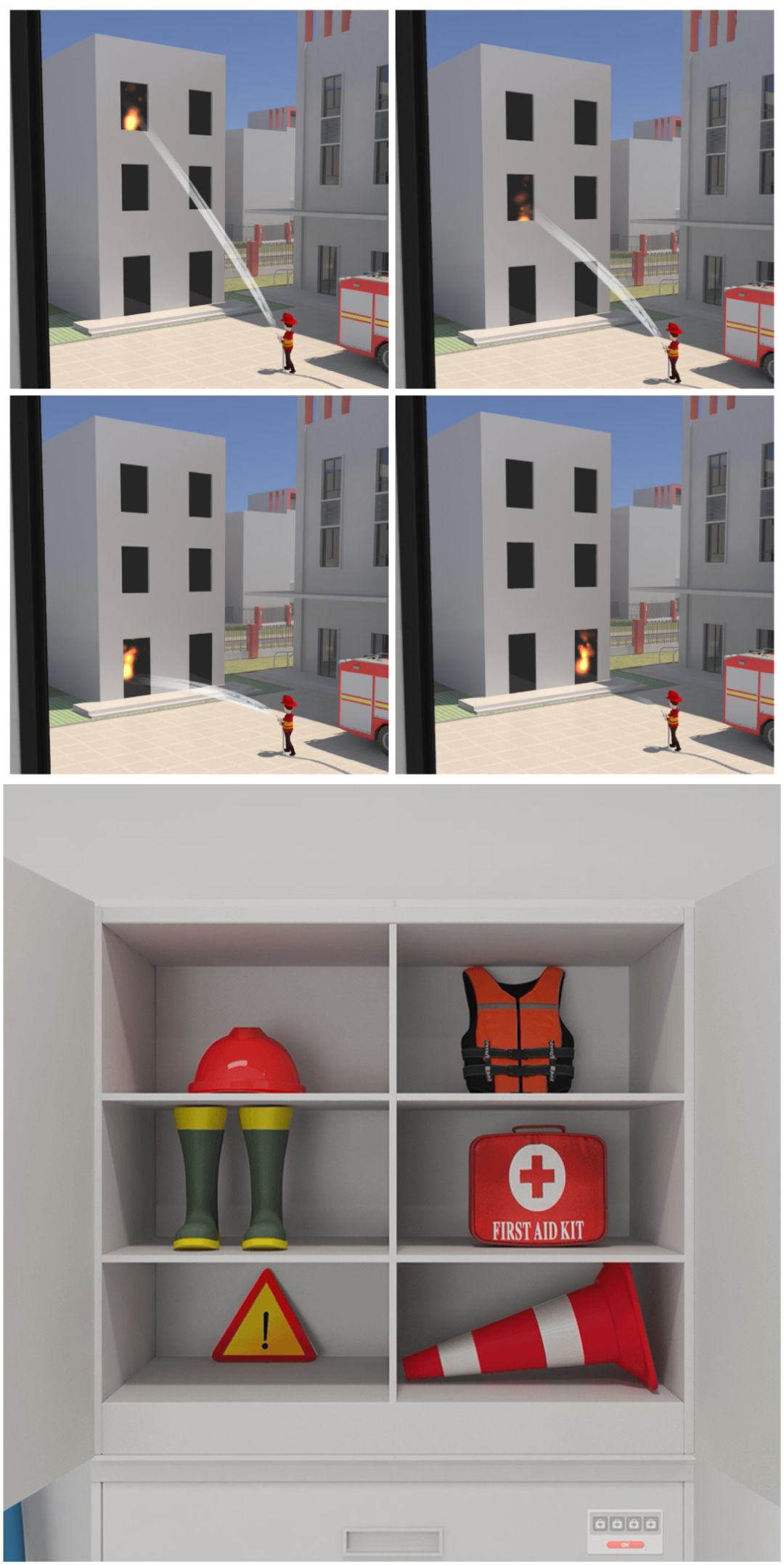 30. 根据灭火的顺序,然后对应之前柜子里的物品(安全帽、靴子、警示标志、路障)。